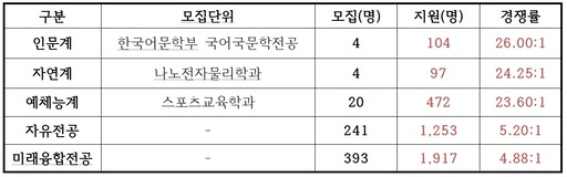 자연계열은 나노전자물리학과가 4명 모집에 97명이 지원, 24.25대 1의 경쟁률, 예체능계열은 스포츠교육학과 20명 모집에 472명이 지원, 23.60대 1의 경쟁률로 집계됐다. 최고 경쟁률 학과는 한국어문학부 국어국문학전공으로, 4명 모집에 104명이 지원해 26.00대 1을 기록했다.
