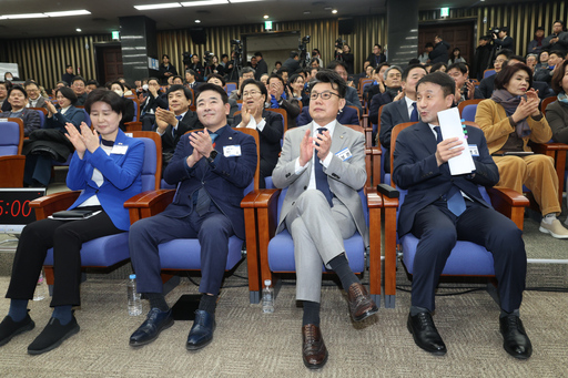 한병도(오른쪽부터), 진성준, 박정, 백혜련 더불어민주당 원내대표 후보자들이 11일 오후 서울 여의도 국회에서 열린 제22대 국회 더불어민주당 제2기 원내대표 선출 의원총회에서 박수를 치고 있다. / 뉴시스