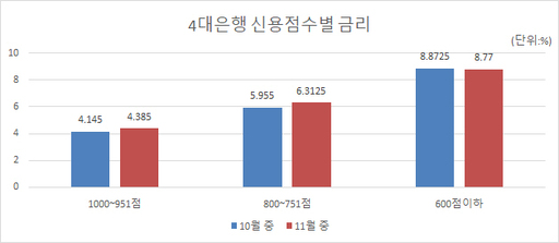 은행연합회에 따르면 11월 중 4대은행이 취급한 신용대출 금리는 고신용자(951~1000점) 기준 연 4.38%로 한달 전(연 4.15%)와 비교해 0.23%p 상승하고, 중신용자(751~800점)는 같은 0.35%p 올랐다. 반면 600점 이하 저신용자는 한달간 연 8.87%에서 연 8.77%로 0.10%p 하락했다. 고신용자와 저신용자 간 금리격차가 좁혀진 셈이다.
