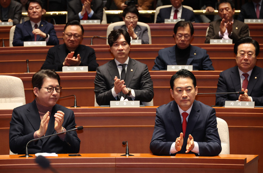 장동혁 국민의힘 대표와 의원들이 15일 서울 여의도 국회에서 열린 의원총회에서 박수를 치고 있다. / 뉴시스
