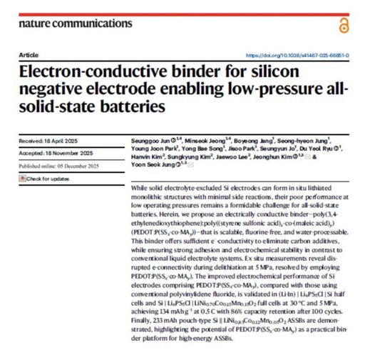이번 연구 성과는 국제 학술지 '네이처 커뮤니케이션스(Nature Communications)'에 지난해 12월 5일 게재됐다. 심사위원들은 기존 액체 전해질 기반 배터리에서는 활용이 제한됐던 전도성 고분자 바인더를 전고체 배터리 환경에서 안정적으로 구현해 적용 범위를 넓혔다는 점을 높이 평가했다.
