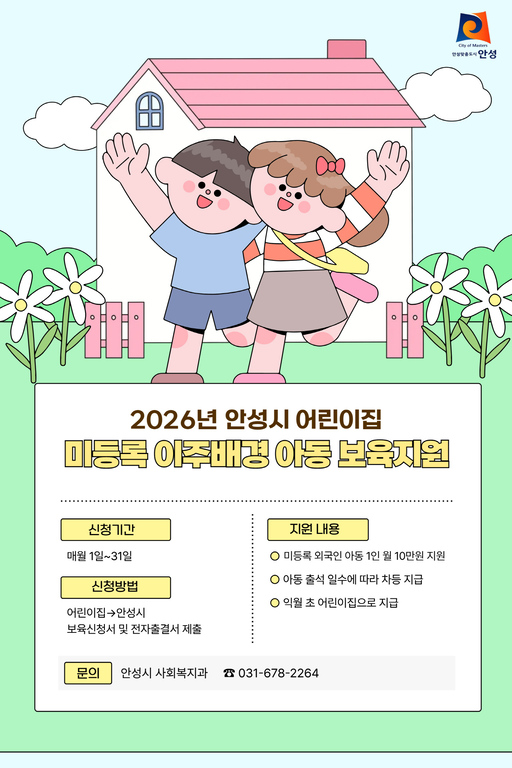 안성시는 2026년부터 어린이집에 다니는 미등록 외국인(이주배경) 영유아에게 월 10만원의 보육지원금을 지원한다고 밝혔다.