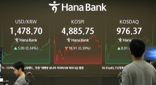 코스피가 전장보다 18.91p 떨어진 4885.75으로 마감한 20일 서울 중구 하나은행에서 딜링룸 딜러가 업무를 보고 있다.