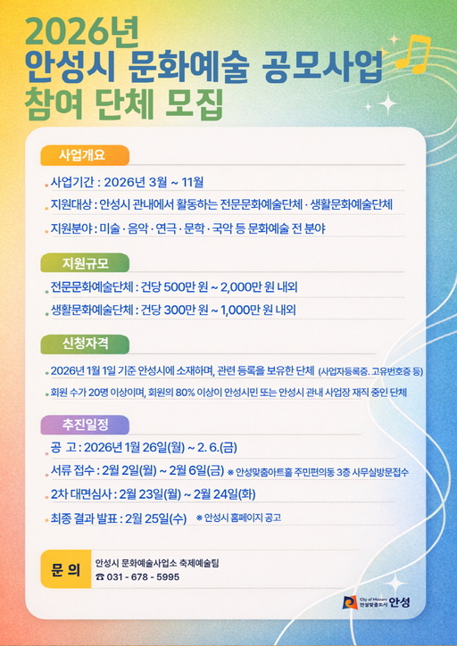 안성시는 2026년 지역 문화예술 활성화를 위해 문화예술 보조금 지원 공모사업 참여 단체를 공개 모집한다고 30일 밝혔다.
