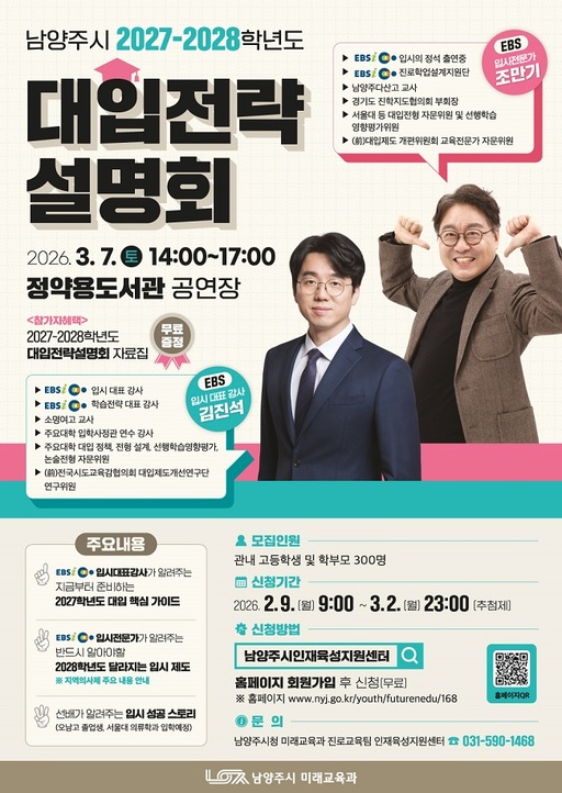 남양주시는 오는 3월 7일 정약용도서관 공연장에서 관내 고등학생과 학부모를 대상으로 '남양주시 2027~2028학년도 대입전략설명회'를 열고, 이에 앞서 2월 9일부터 참가 신청 접수를 진행한다.