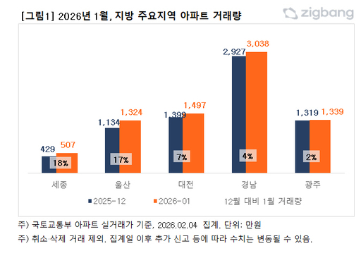 8일 직방에 따르면 국토교통부 아파트 실거래가를 분석한 결과, 올해 계약일 기준 세종시는 1월 거래량이 507건으로 전월 대비 18% 증가했고, 울산도 1324건으로 전월 대비 17% 늘었다. 대전 1497건(7% ↑), 경남 3038건(4% ↑), 광주 1339건(2% ↑) 등이다.