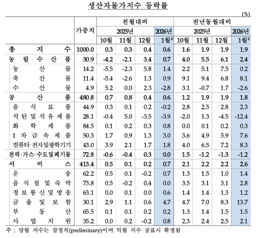 24일 한국은행이 발표한 '2026년 1월 생산자물가지수(잠정)'에 따르면 1월 생산자물가는 농림수산품(0.7%), 공산품(0.6%), 서비스(0.7%)가 오르면서 전월보다 0.6% 상승했다. 전력·가스·수도 및 폐기물은 산업용도시가스 상승과 폐기물처리 하락이 엇갈리며 전월대비 보합을 나타냈다.