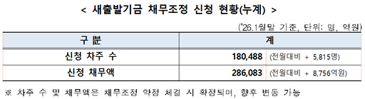 한국자산관리공사(캠코)와 신용회복위원회는 지난 1월 말 기준 '새출발기금' 의 누적 채무조정 신청자 수가 18만488명, 누적 신청 채무액은 28조6083억원 규모로 집계됐다고 24일 밝혔다.