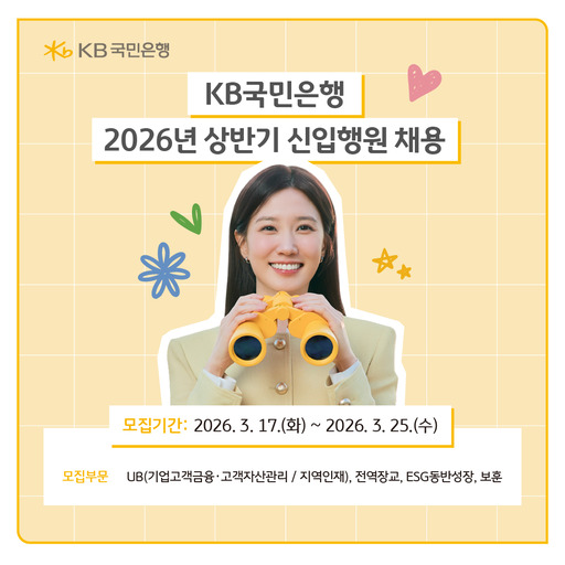 KB국민은행은 2026년 상반기 신입행원을 채용을 실시한다고 18일 밝혔다. 채용규모는 약 110여 명이다.