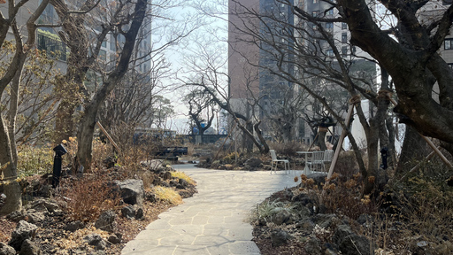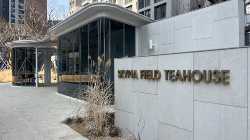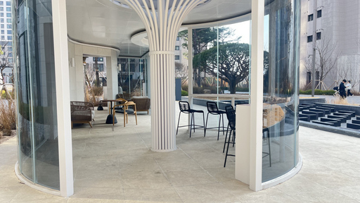 뒤쪽으로는 티하우스가 마련돼 있다. 곡선 형태의 지붕과 유리 벽면이 결합된 구조로, 조경과 시각적으로 연결된다. 완전히 닫힌 실내 공간이 아니라 일부가 개방된 형태다. 외부와 단절되지 않아 중앙부 수경시설의 물소리를 들으며 여유로운 시간을 보낼 수 있다.