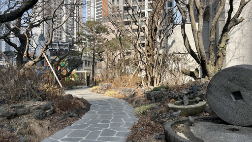세 개의 돌이 수직으로 쌓인 구조는 균형과 긴장을 동시에 만들어낸다. 주변 석재와 자갈, 벽면 조경과 어우러지며 작은 정원 형태의 공간을 이룬다. 단지 외곽에 위치해 있지만, 독특한 설치 미술이 멀리서도 시선을 끈다.
