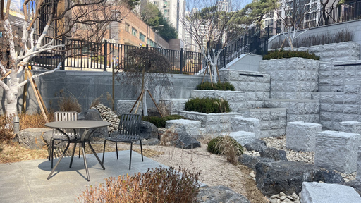 벽천 아래에는 자갈과 대형 석재를 불규칙적으로 배치해 자연의 모습을 완성했다. 직선적인 아파트 공간에 입체감을 더한다.