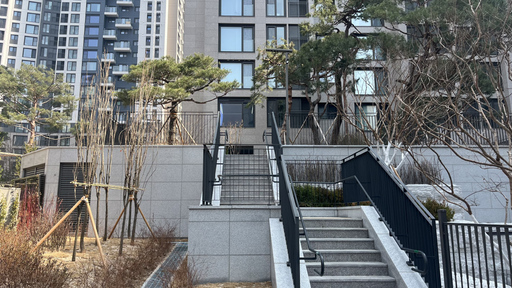 이문아이파크자이는 단차를 활용한 입체적인 동선 구조가 특징이다. 돌계단과 경사로를 통해 높이가 다른 동들을 자연스럽게 연결한다. 수목과 휴게 공간, 조형물이 한눈에 들어오는 이동 동선은 산책길이 된다. 단지 안에서 걷고 머무는 시간이 곧 휴식인 셈이다. 계단을 따라 이동하는 과정에서 단지 전경이 시야에 들어오면 발걸음을 멈추고 눈앞의 풍경을 바라보게 된다.
