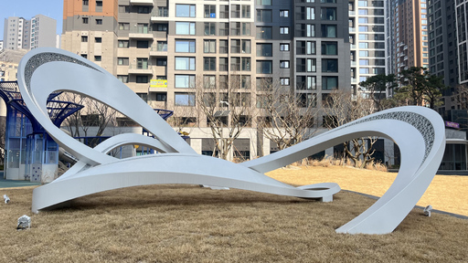 단지 내부로 들어서면 중앙부에 조형물이 먼저 눈에 들어온다. 장용선 작가의 작품 '시머링 웨이브(SHIMMERING WAVE)'다. 달빛에 반사된 밤바다의 파도를 모티브로 절제된 곡선을 표현했다. 고요하면서도 역동적인 파도의 움직임을 연상시킨다.