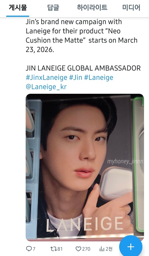 실제로 방탄소년단 진이 직접 소개하는 크림스킨, 네오쿠션 등은 아모레퍼시픽만의 K뷰티 기술력이 집약됐다. 크림 스킨의 경우 세안 후 첫 단계에서 피부 보습을 위해 사용하는 제품으로 크림 한 통을 토너에 담아낸 라네즈만의 고압 블렌딩 기술이 적용됐다. 네오쿠션은 피부 속당김은 개선하면서도 피부 겉은 매끈하게 표현할 수 있는 제품이다.