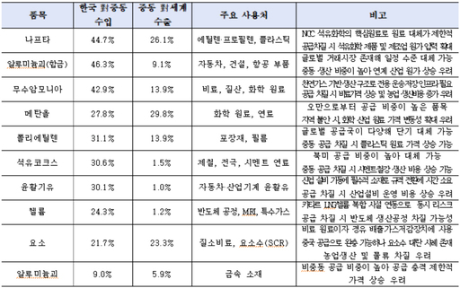 호르무즈 봉쇄 시 주요 공급 리스크 품목의 중동 의존 현황 /자료=산업연구원