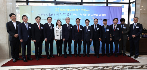 지난 24일 메트로신문(메트로경제) 주최로 서울 명동 은행회관에서 열린 '2026 100세 플러스 포럼 시즌1'에서 주요 인사들이 포즈를 취했다. (왼쪽부터) 윤종연 하나은행 PB팀장, 정완규 여신금융협회장, 이병래 손해보험협회장, 조용병 은행연합회장, 정운영 금융과행복네트워크 이사장, 고승범 청소년금융교육협의회장(전 금융위원장), 이장규 메트로경제신문 대표이사, 신진창 금융위원회 사무처장, 김영익 한양대 미래인재교육원 겸임교수, 김철주 생명보험협회장, 박원갑 KB국민은행 부동산 수석전문위원, 이승우 유진투자증권 리서치센터장, 김택동 레이크투자자문 사장.