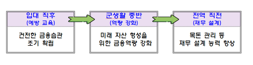 군생활 중반에는 금융기초지식과 신용관리 능력 향상에 중점을 둔다. 방문교육과 온라인 교육을 병행하고, 군 내부에서 자체적으로 금융교육을 운영할 수 있도록 재정장교 등 담당 인력에 대한 연수도 확대한다. 기존 연 1회였던 연수를 2회로 늘리고, 대상도 부사관과 군무원까지 넓혀 교육 인프라를 강화할 방침이다.