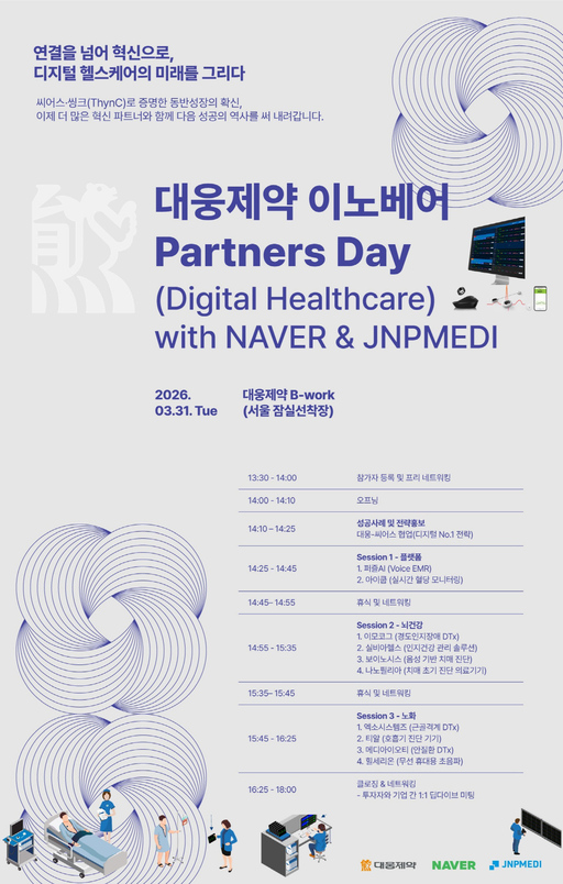 대웅제약은 31일 서울 잠실 선착장 비 워크에서 '대웅제약 이노베어 파트너스 데이(디지털 헬스케어) 위드 네이버&제이앤피메디'를 개최한다. 대웅제약이 주최하고 네이버와 제이앤피메디가 공동 참여한다.