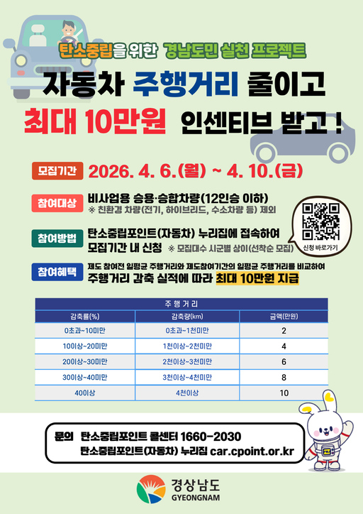자동차 탄소중립포인트제는 주행 거리 감축 실적을 산정해 현금 인센티브를 지급하는 제도다. 감축 실적에 따라 최소 2만원에서 최대 10만원을 받을 수 있다. 올해 경남도 총 모집 대수는 9720대이며, 1차 모집에서는 6679대가 신청해 약 69%의 참여율을 기록한 바 있다.