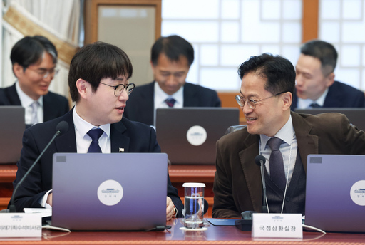 이재명 대통령은 9일 부산 북갑 국회의원 보궐선거 출마설이 나오는 하정우 청와대 AI미래기획수석에게 "작업 들어온다고 넘어가면 안 된다"고 밝혔다. 이와 관련해 정청래 더불어민주당 대표는 "당에서 필요한 인재"라고 강조했다. 사진은 하정우 AI미래기획수석과 김정우 국정상황실장이 9일 청와대에서 열린 수석보좌관회의에서 대화를 하는 모습. /뉴시스(청와대통신사진기자단)