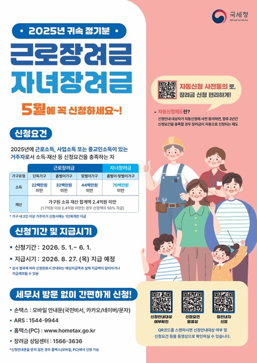 근로·자녀장려금은 근로·사업·종교인 소득이 있는 저소득 가구에 현금을 지원하는 제도다. 신청 대상은 2025년에 해당 소득이 있는 거주자로, 가구 유형별 소득 기준과 재산 요건을 충족해야 한다.