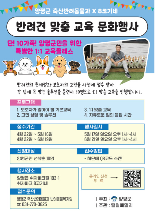 이번 교육은 양평 쉬자파크에서 5월 17일과 6월 21일 오후 1시부터 4시까지 회차별로 진행되며, 사전 신청을 통해 선정된 10팀씩 총 20팀을 대상으로 운영된다. 특히 양평군 홍보대사이자 45만 구독자를 보유한 유튜브 채널 '8코기네'의 전승우 훈련사와 반려견 행동전문가 10명이 참여해 1대1 맞춤형 야외 실습과 현장 교정 지도를 진행할 예정이다.