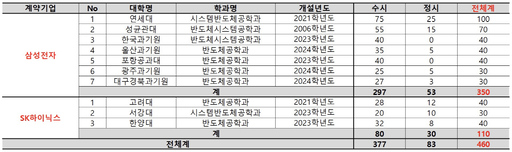 2027학년도에는 삼성전자와 SK하이닉스 계약학과 모집 규모는 총 460명으로 예상된다. 삼성전자는 연세대 100명, 성균관대 70명, 한국과학기술원 40명, 울산과학기술원 40명, 광주과학기술원 30명, 대구경북과학기술원 30명, 포항공대 40명 등 7개 대학에서 350명을 선발한다. SK하이닉스는 고려대 40명, 서강대 30명, 한양대 40명 등 3개 대학에서 110명을 선발한다.