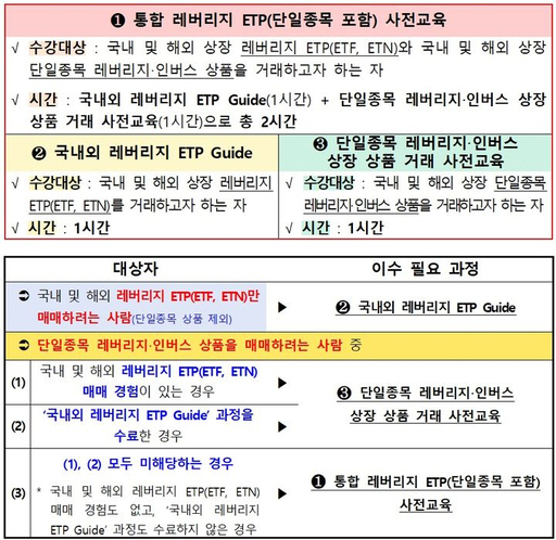 투자자는 해당 상품에 투자하기 전 반드시 사전교육을 이수해야 한다. 기존에 국내·외 레버리지 ETP(ETF·ETN 등) 거래 경험이 있는 경우 1시간 심화 과정만 수강하면 되지만, 경험이 없는 투자자는 기본 교육을 포함해 총 2시간의 과정을 이수해야 한다.